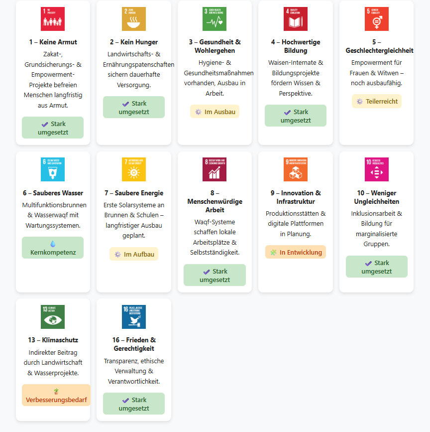 | 8 – Menschenwürdige Arbeit & Wirtschaftswachstum | Faire Arbeit & lokale Ökonomie | ✔️ Empowerment & Waqf-Systeme schaffen Arbeitsplätze & Selbstständigkeit. | Stark umgesetzt |